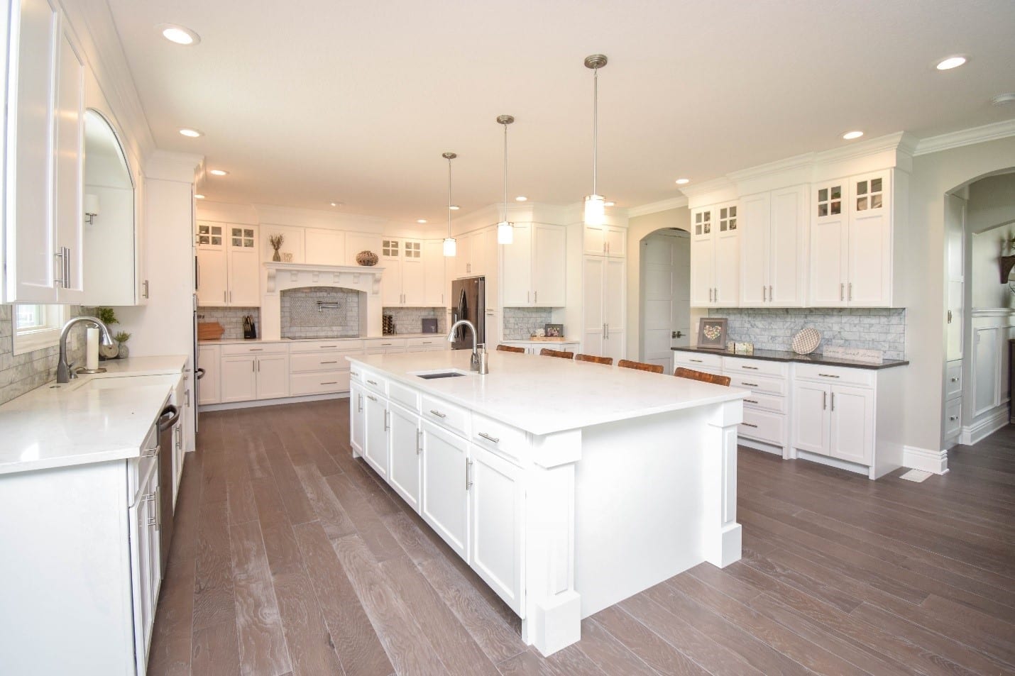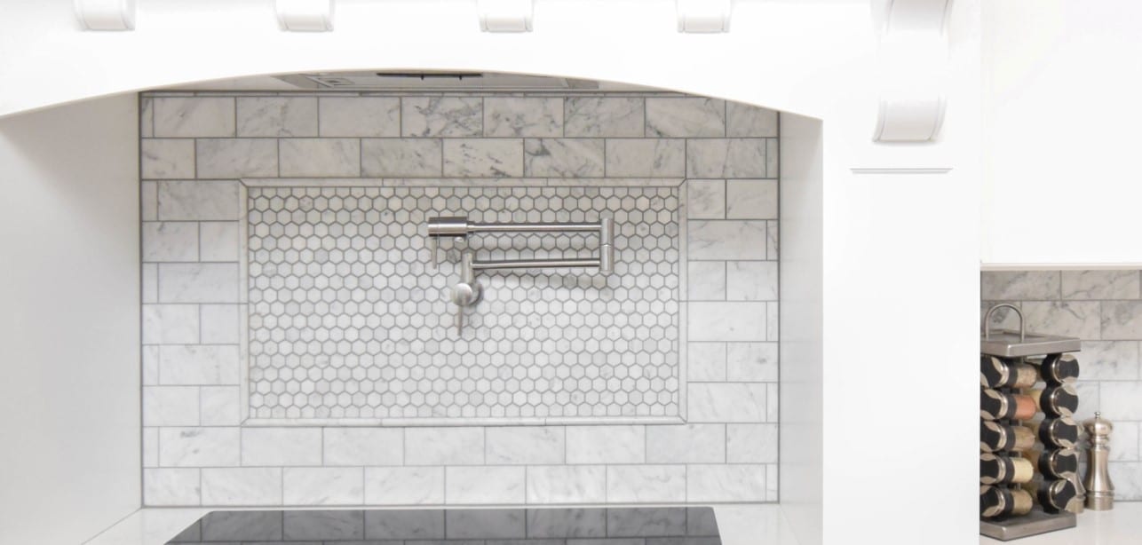 Another area we worked on with this client was their backsplash. To keep their large kitchen bright and airy, they selected a 3×6 marble subway tile and paired that with a small hexagon mosaic over the range to make that area more of a statement piece, along with their mantel hood. This backsplash goes perfect with the white cabinetry and also ties in textures and colors in the flooring by pulling more of those gray areas in the wood floors up to eye level.