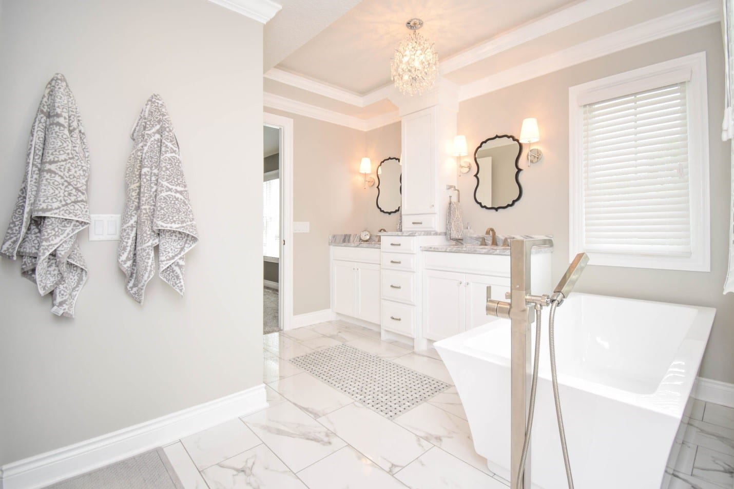 In the master bath, the clients created an oasis with a 12×24 marble-look porcelain tile and paired it with a marble basket-weave mosaic rug inset by their vanity. The advantage to putting in a marble-look tile versus authentic marble is that porcelain tile does not have to be sealed. You also get more consistency in color and texture because porcelain is a man-made product, not a natural stone. You get all the beauty without all the maintenance!
