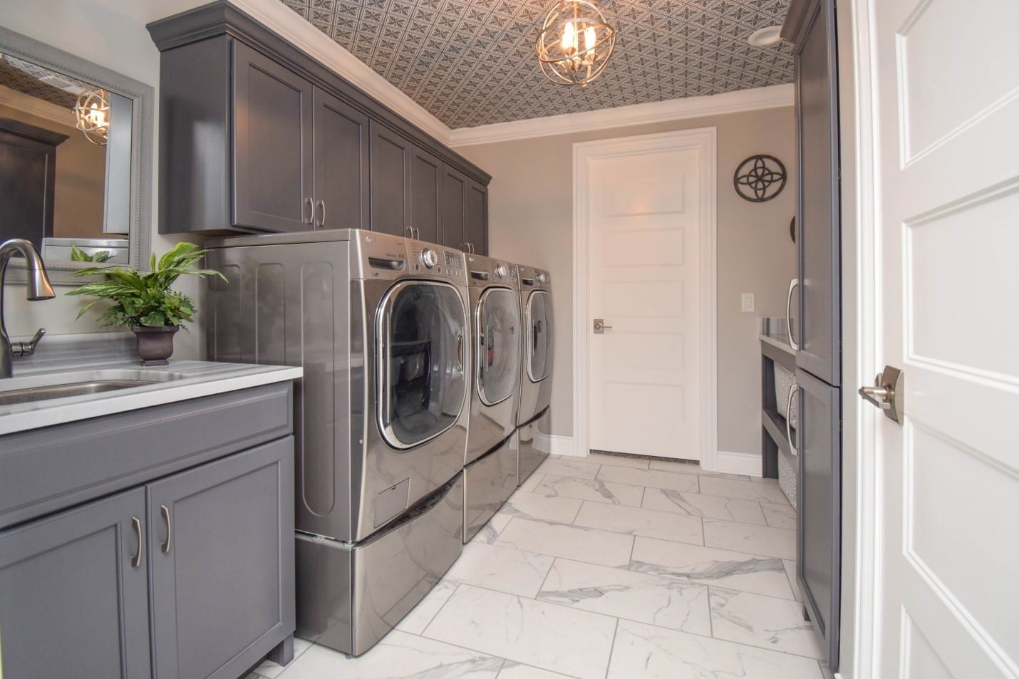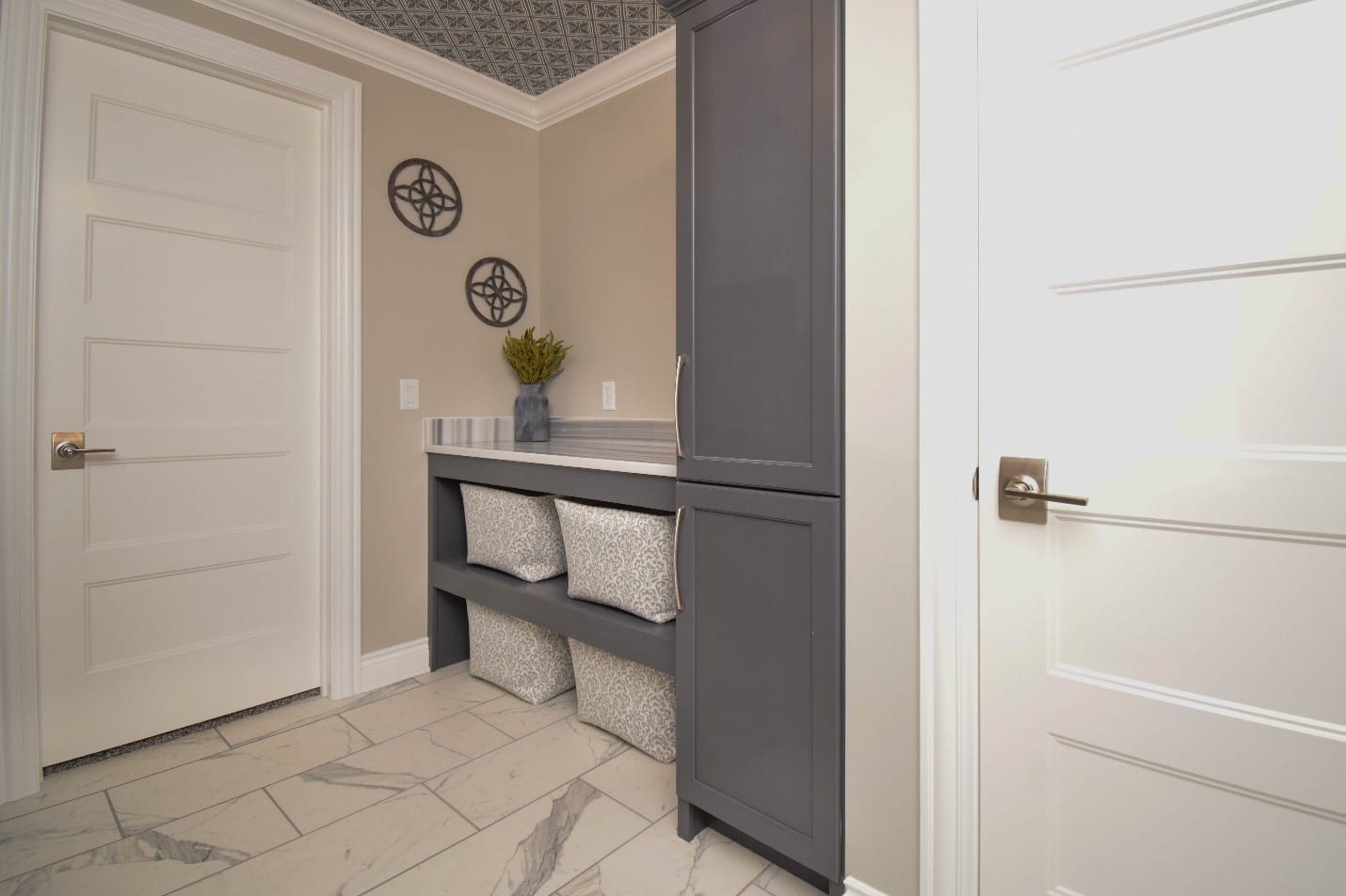 One thing we really loved about working with these clients is that they were so thoughtful when planning out the spaces in their home. Having two washers is just one way these clients made their home more functional for their busy family! Their laundry room features the same marble-look porcelain tile as the master bath but in a matte finish. On the opposite side of the washers and dryer is a countertop with baskets underneath that gives the homeowners ample space for folding and organizing clothes.