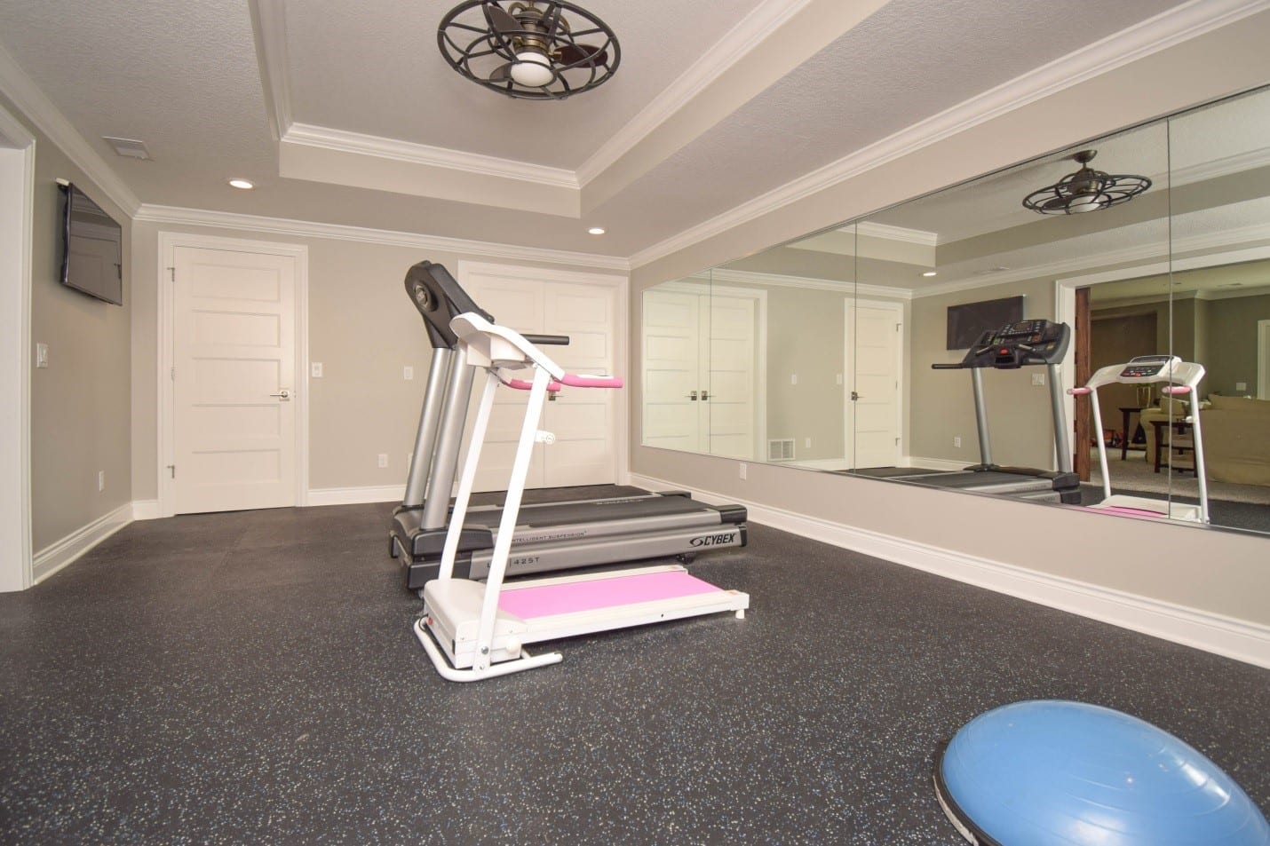 The basement exercise room features a 36”x26” interlocking rubber gym floor which is ¾” thick and can withstand weights being dropped on it but also providing some comfortable cushioning for high impact workouts. PS – that pink treadmill is one of the cutest things we’ve ever seen!